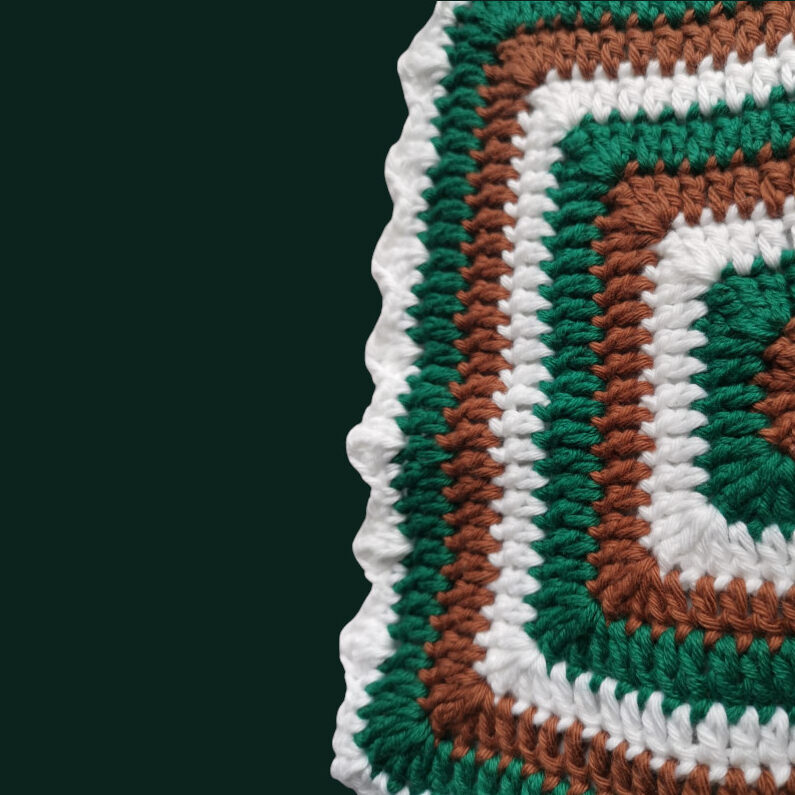 Dieser Topflappen ist tatsächlich ohne eine Anleitung entstanden, da ich etwas ausprobieren wollte und einfach drauf los gehäkelt habe. Aber theoretisch ist es einfach nur ein solid Granny Square mit Farbwechseln nach jeder Runde. Auch bei der Umrandung habe ich einfach drauf los gehäkelt und etwas ausprobiert. Und ich finde es sieht so gut aus.