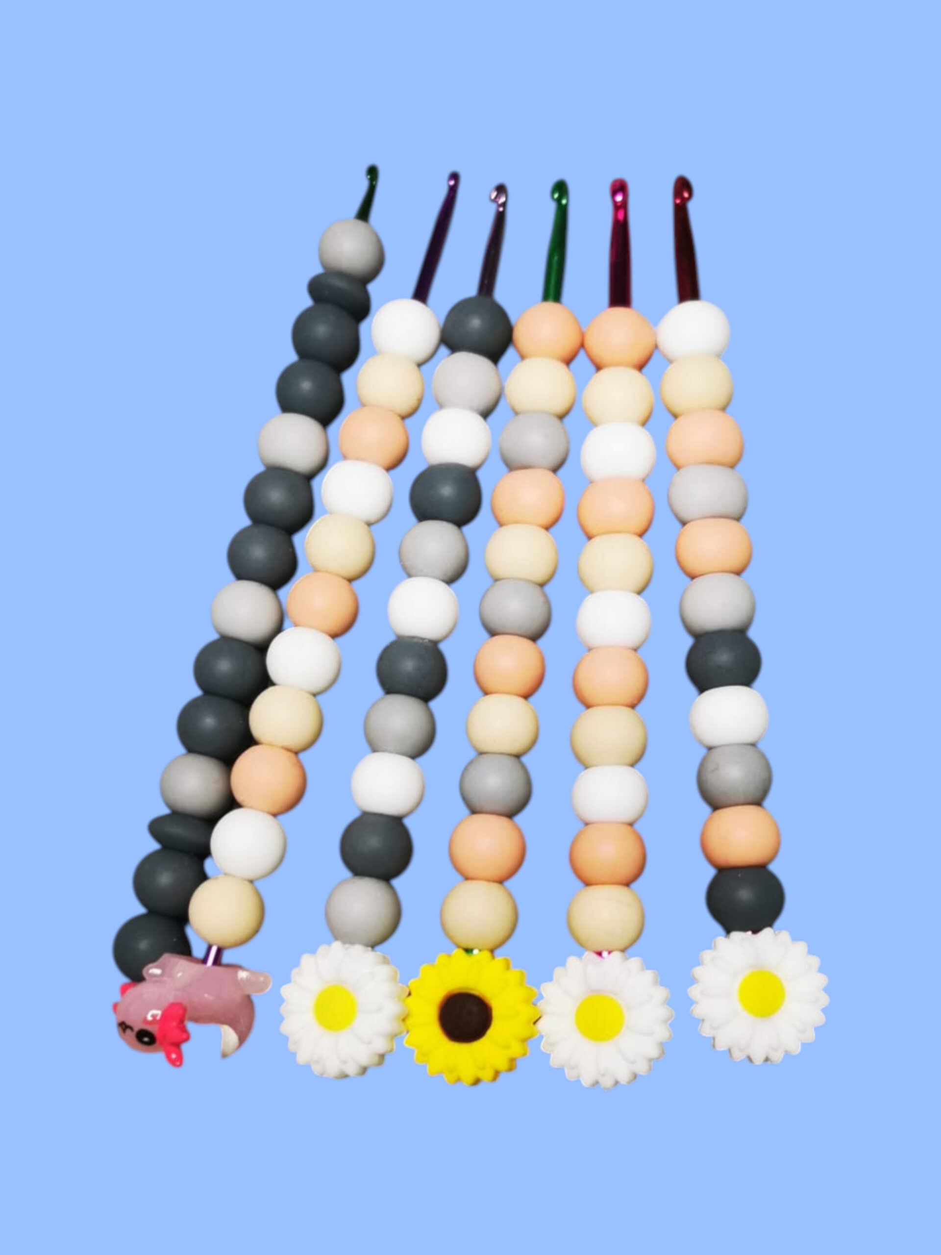 Jede Nadel ist mit hochwertigen Silikonperlen, zarten Silikonblumen oder verspielten kleinen Puppen verziert und liebevoll von Hand gestaltet. Ob du lieber pastellige Töne magst, kräftige Farben oder niedliche Figuren, bei meinen Designs findest du sicher eine Nadel, die genau zu dir passt. Oder du wählst ganz bewusst ein Modell, das dich einfach zum Lächeln bringt. Denn warum sollte das Werkzeug, das uns durch so viele schöne Stunden begleitet, nicht auch ein kleines Stück Freude sein?